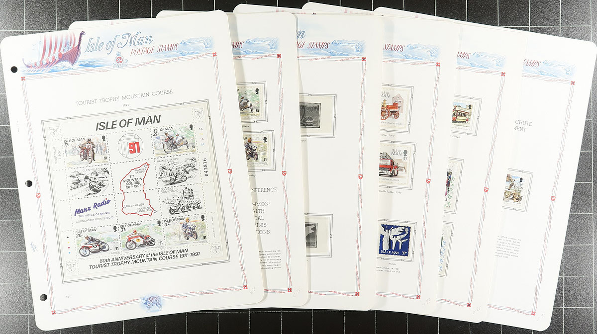 Lovely collection of primarily never hinged Isle of Man, 1973-1994, containing roughly 1,250 stamps in an album and binder. The album contains 770 stamps, neatly organized in White Ace hingeless pages, ranging from Scott #12/622, including souvenir sheets and booklets, with the binder containing roughly 500 stamps in stock pages, ranging from Scott #12/245, including singles, gutter pairs, souvenir sheets, and more. A nice clean lot for collectors and dealers alike. 2026 Scott US$732.00 =