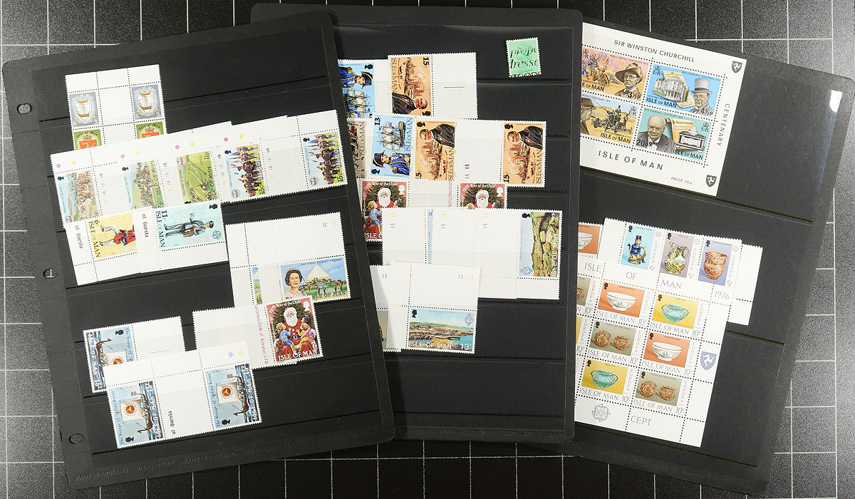 Lovely collection of primarily never hinged Isle of Man, 1973-1994, containing roughly 1,250 stamps in an album and binder. The album contains 770 stamps, neatly organized in White Ace hingeless pages, ranging from Scott #12/622, including souvenir sheets and booklets, with the binder containing roughly 500 stamps in stock pages, ranging from Scott #12/245, including singles, gutter pairs, souvenir sheets, and more. A nice clean lot for collectors and dealers alike. 2026 Scott US$732.00 =