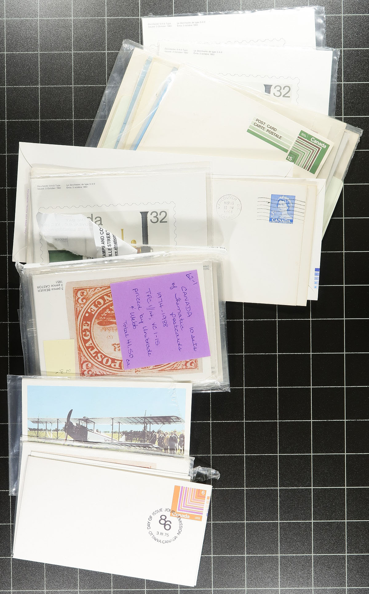Nice accumulation of used and unused Canada postal stationery, 1870's-2000's, containing roughly 350 items in a few binders and several loose items. A cursory check indicated a wide variety of items including postal cards, reply cards, air letters, envelopes of various sizes, postage paid cards, UPU postcards, business reply cards, and more. We note a fairly even mix of used and unused items, including several used from the Victorian era up to the 1950's. A nice lot for the postal stationery specialist as we spotted a few items cataloguing from $5 to $10 each. Estimate =