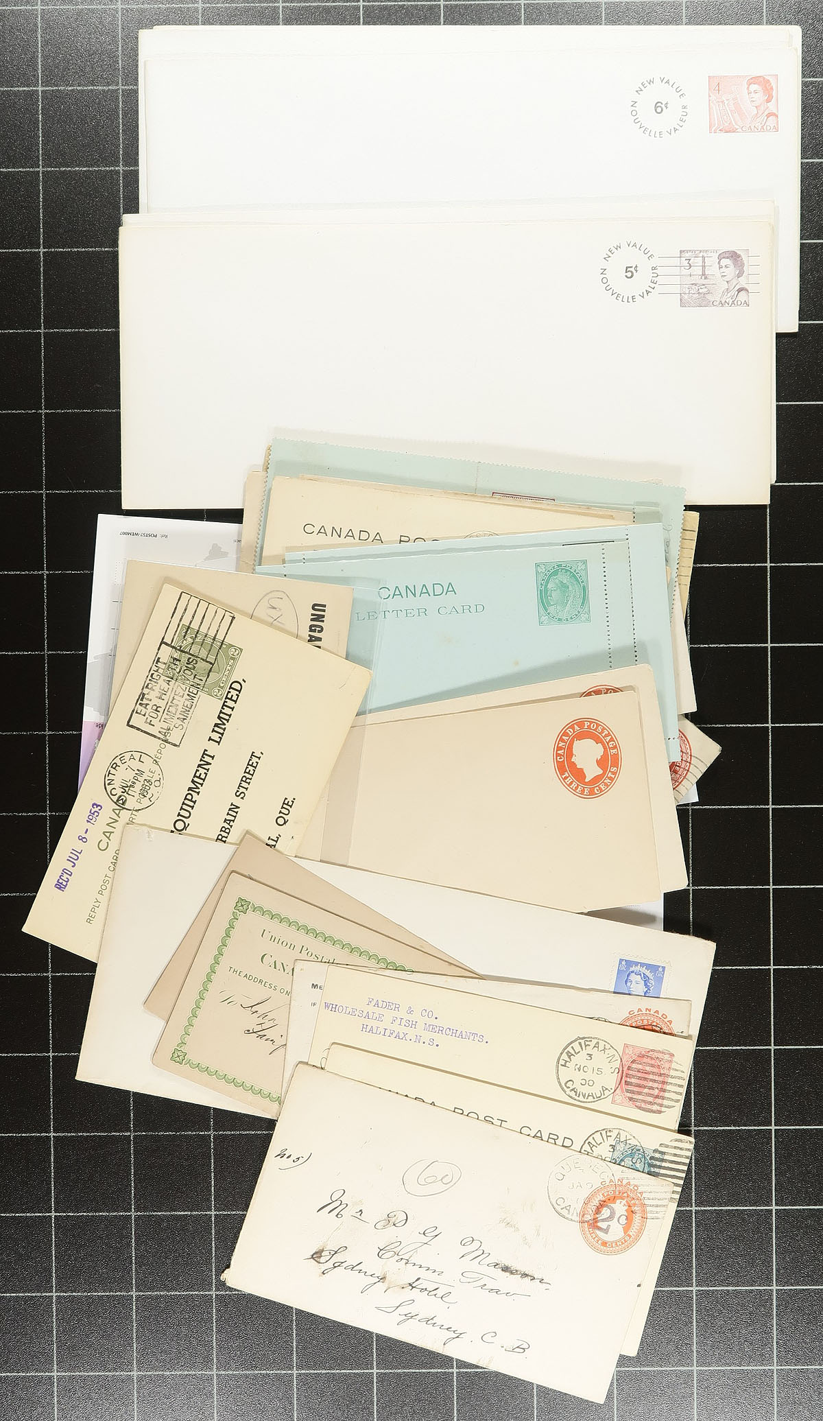 Nice accumulation of used and unused Canada postal stationery, 1870's-2000's, containing roughly 350 items in a few binders and several loose items. A cursory check indicated a wide variety of items including postal cards, reply cards, air letters, envelopes of various sizes, postage paid cards, UPU postcards, business reply cards, and more. We note a fairly even mix of used and unused items, including several used from the Victorian era up to the 1950's. A nice lot for the postal stationery specialist as we spotted a few items cataloguing from $5 to $10 each. Estimate =