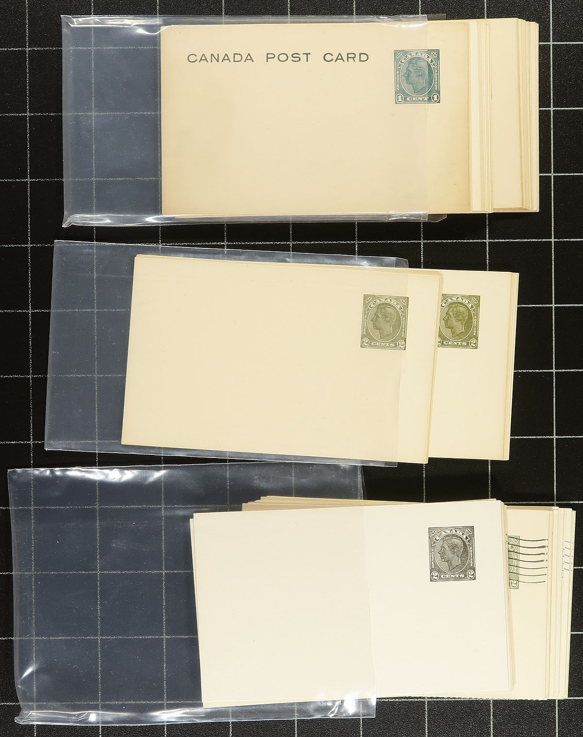Nice accumulation of used and unused Canada postal stationery, 1870's-2000's, containing roughly 350 items in a few binders and several loose items. A cursory check indicated a wide variety of items including postal cards, reply cards, air letters, envelopes of various sizes, postage paid cards, UPU postcards, business reply cards, and more. We note a fairly even mix of used and unused items, including several used from the Victorian era up to the 1950's. A nice lot for the postal stationery specialist as we spotted a few items cataloguing from $5 to $10 each. Estimate =