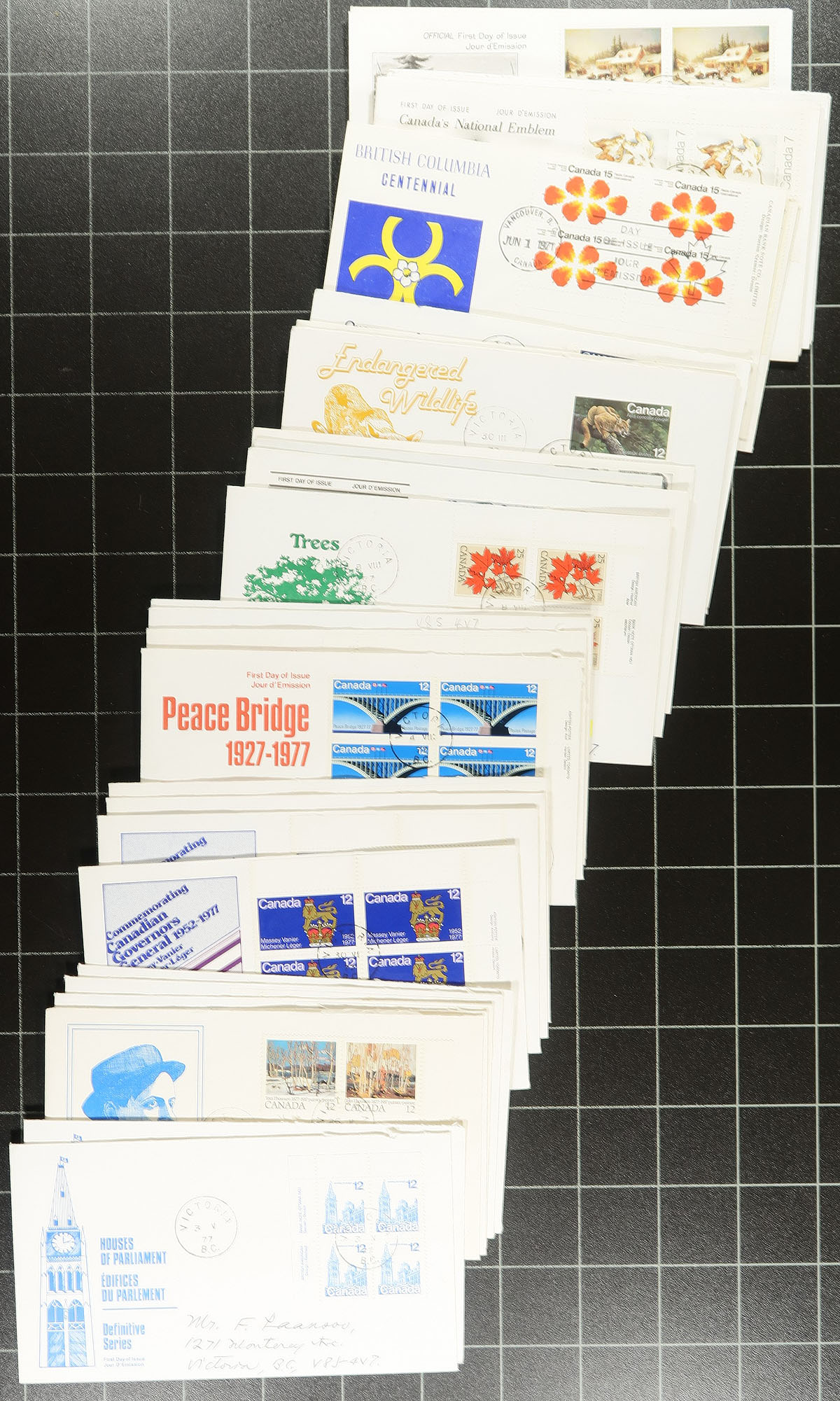 Nice group of Canada first day covers collected for British Columbia postmarks, 1959-1979. We note single, block, and a few plate block frankings, primarily with Victoria, Vancouver, Summerland, and Penticton postmarks. Many of the covers have private cachets from makers Rose Craft, Cole, modern cachets from NR Covers, and more. A nice lot with some mild duplication for some issues, and a few have been opened at the top, ideal for the first day cover or postmark collector. Estimate =