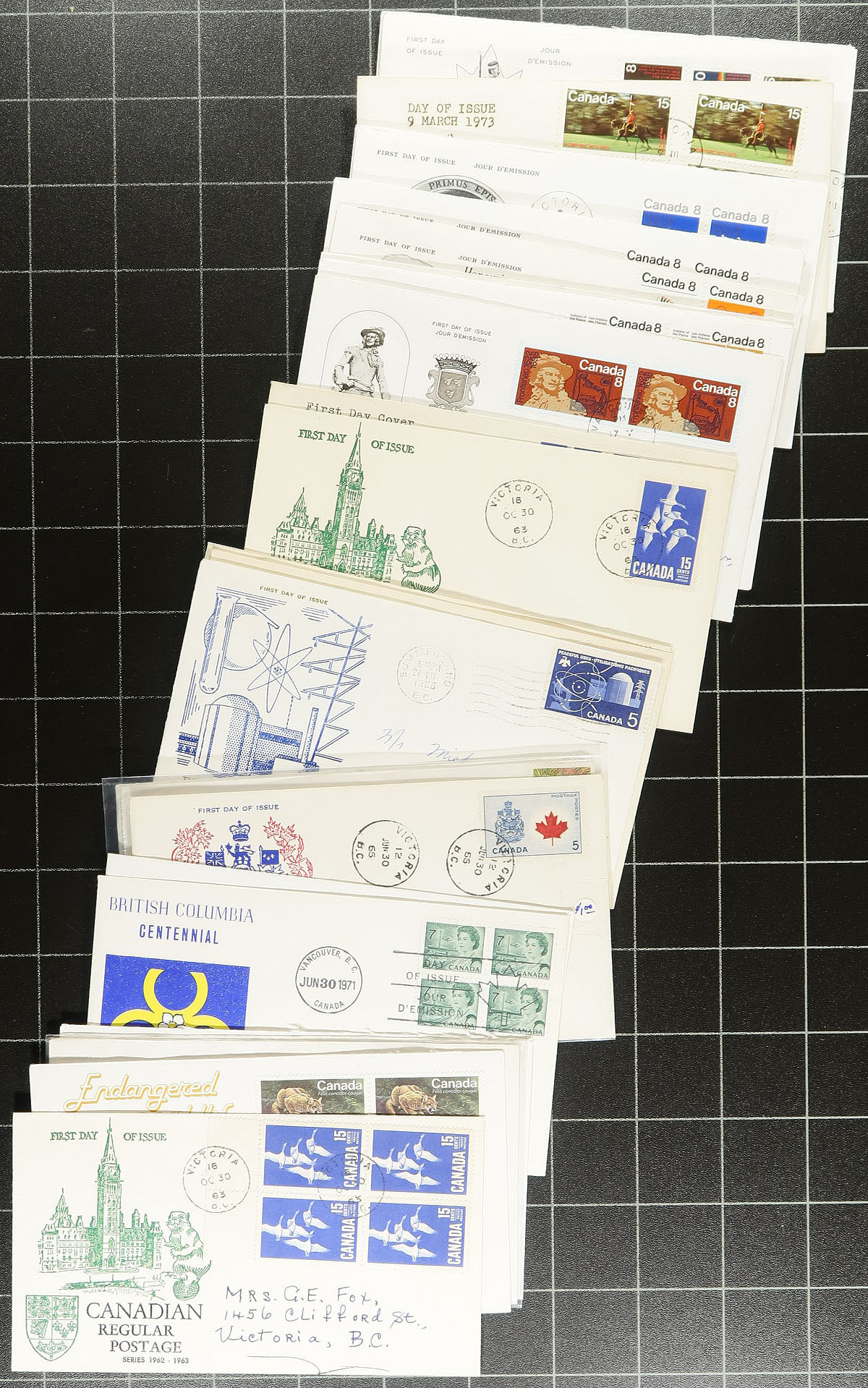 Nice group of Canada first day covers collected for British Columbia postmarks, 1959-1979. We note single, block, and a few plate block frankings, primarily with Victoria, Vancouver, Summerland, and Penticton postmarks. Many of the covers have private cachets from makers Rose Craft, Cole, modern cachets from NR Covers, and more. A nice lot with some mild duplication for some issues, and a few have been opened at the top, ideal for the first day cover or postmark collector. Estimate =
