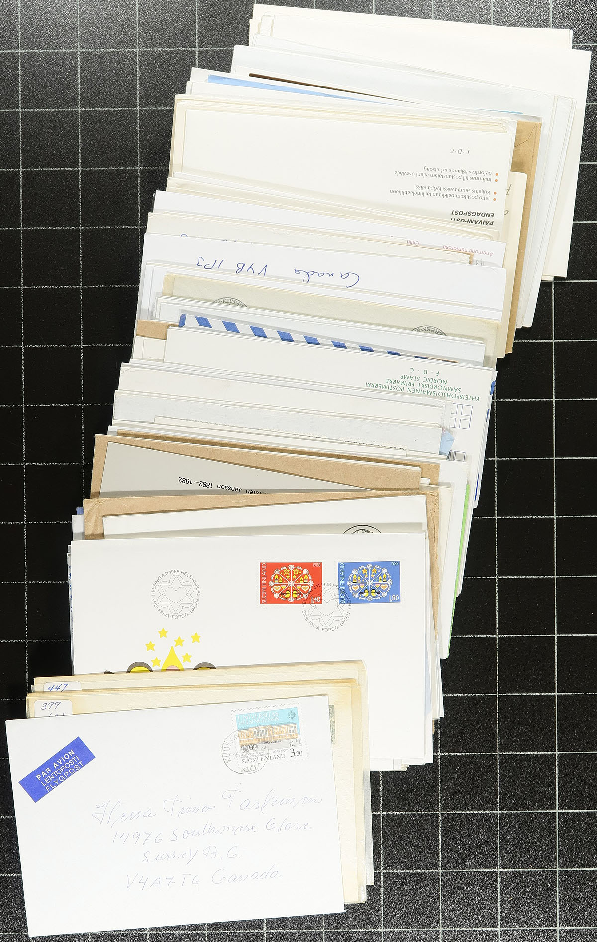 Nice accumulation of roughly 400 Finland covers, 1940's-1990's, loose in a box, noting a good variety of items including first day covers, commercial covers, postal stationery, postcards, maximum cards, meter mail, paying domestic, registered and airmail rates. We note a good variety of postmarks (including several pictorials), a few labels, a wide variety of frankings, and more. A nice lot for the Finland or worldwide postal history collector. A few faults with a few of the commercial covers, overall fine to very fine. Estimate =