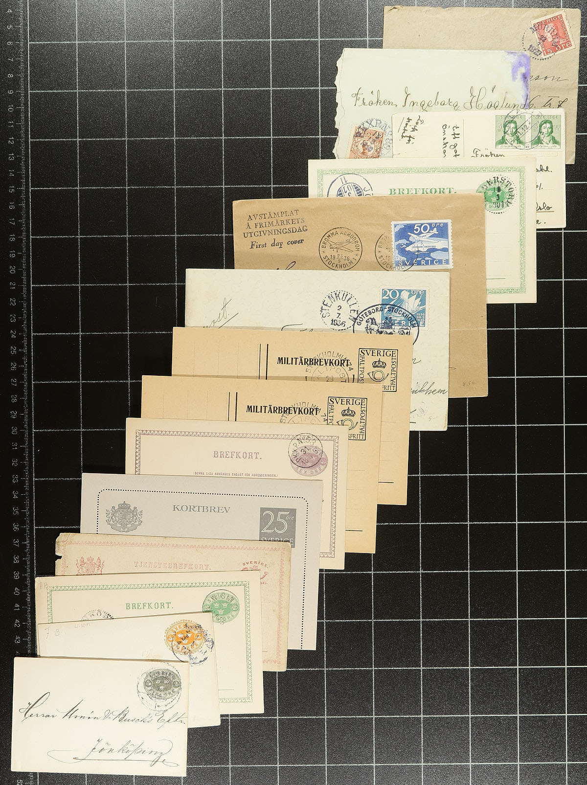 Good group of roughly 150 Sweden covers, 1900's-1940's, loose in a box, noting a nice variety of items including post cards, postal stationery, censor mail, first day covers, commercial mail, paying domestic, registered, and airmail rates. Postmark interest includes cds types, along with a good variety of frankings. A nice lot for the Sweden or worldwide postal history collector. Estimate =