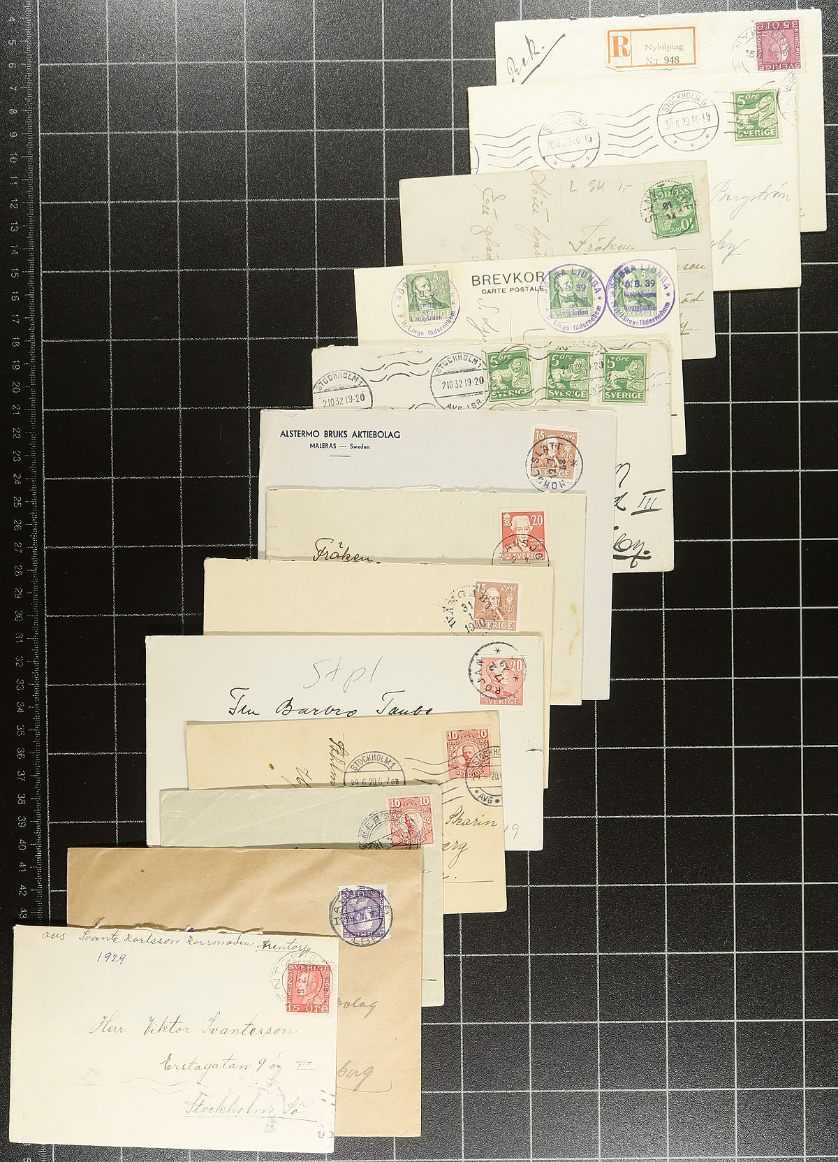Good group of roughly 150 Sweden covers, 1900's-1940's, loose in a box, noting a nice variety of items including post cards, postal stationery, censor mail, first day covers, commercial mail, paying domestic, registered, and airmail rates. Postmark interest includes cds types, along with a good variety of frankings. A nice lot for the Sweden or worldwide postal history collector. Estimate =
