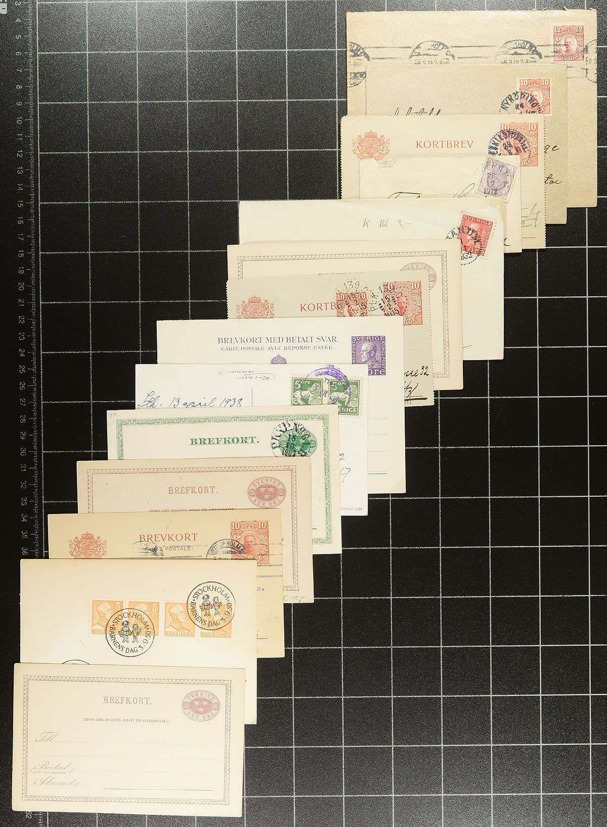 Good group of roughly 150 Sweden covers, 1900's-1940's, loose in a box, noting a nice variety of items including post cards, postal stationery, censor mail, first day covers, commercial mail, paying domestic, registered, and airmail rates. Postmark interest includes cds types, along with a good variety of frankings. A nice lot for the Sweden or worldwide postal history collector. Estimate =