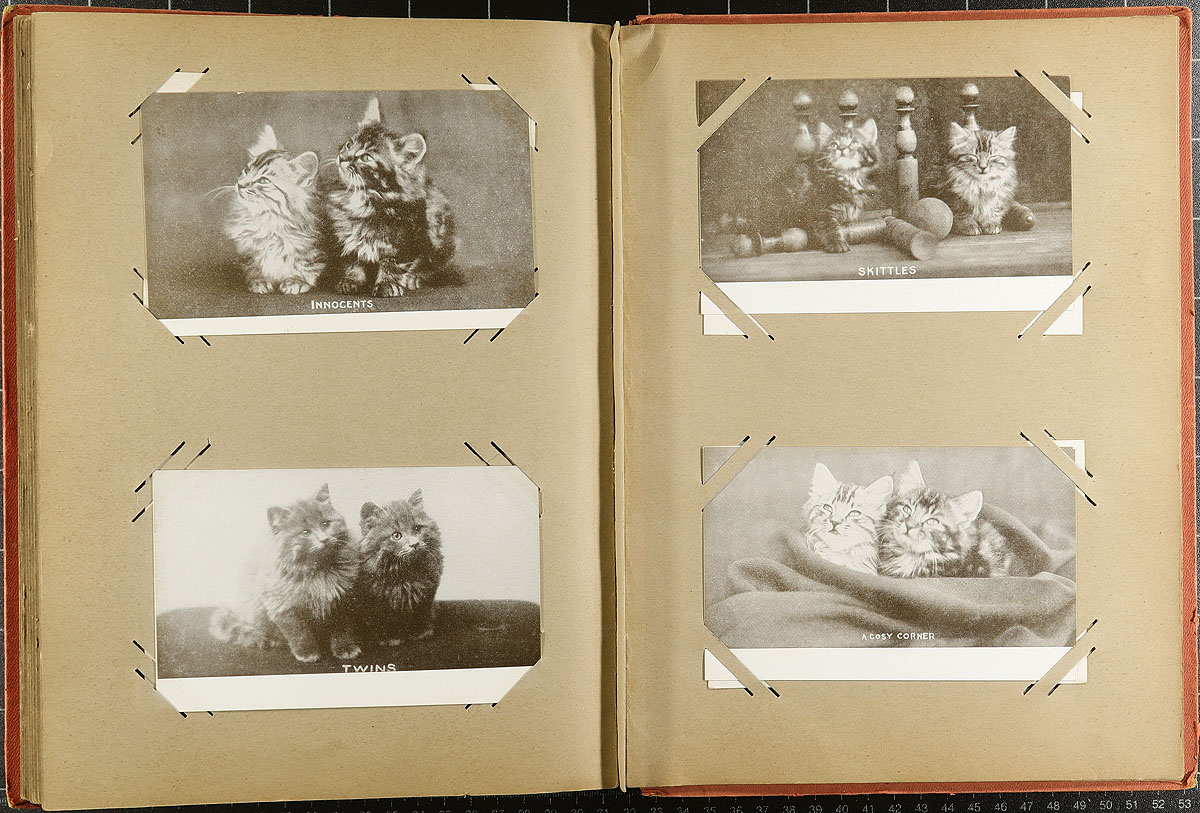 Nice collection of roughly 180 Canada and worldwide postcards in two postcard albums, 1900's-1930's. The lot essentially consists of two equal parts, the first album contains 90 worldwide cards (mostly colour, sepia and real photo cards), almost all with Great Britain views, with the second album containing Canada views (mostly Western and Central provinces), containing mostly color and real photo cards. We note a variety of subjects including buildings, cats, Christmas and Easter, scenic views and more. A nice lot with a few cards beyond the given date range, with most being in very fine condition. Estimate =