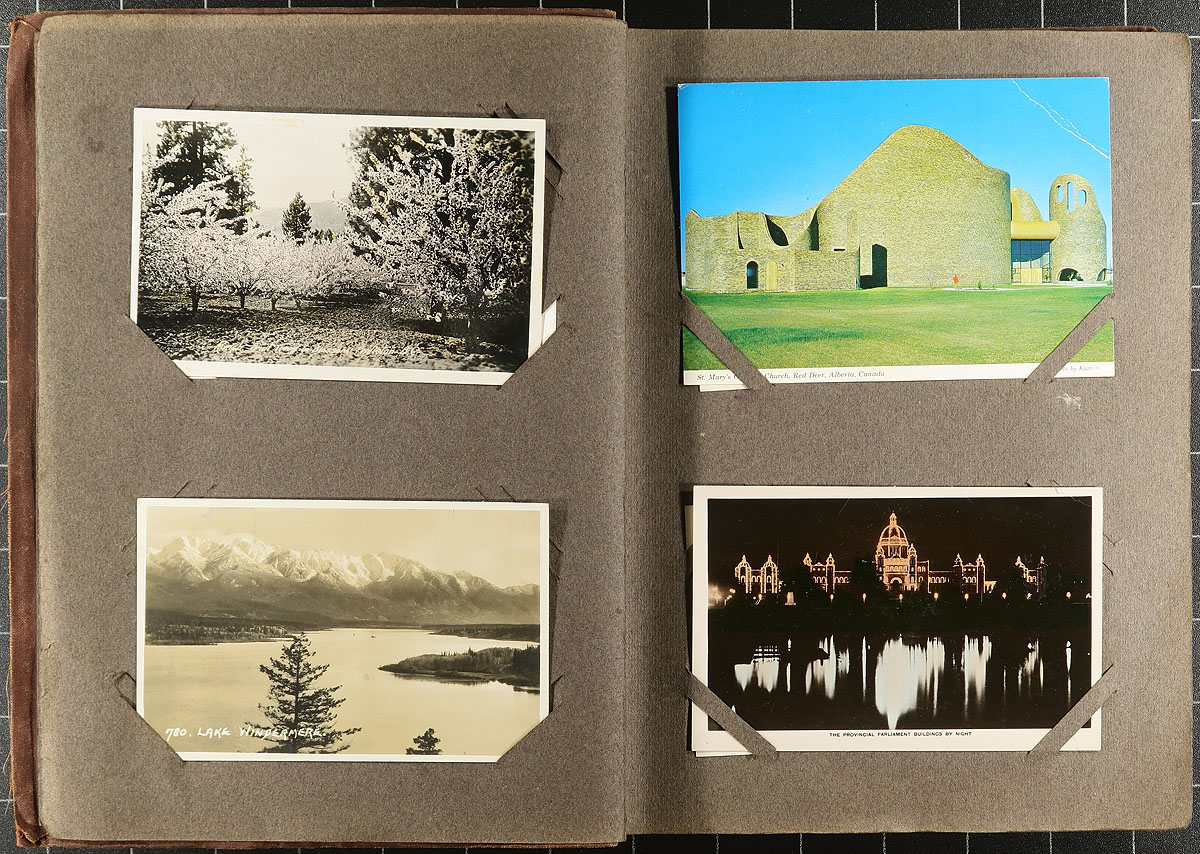 Nice collection of roughly 180 Canada and worldwide postcards in two postcard albums, 1900's-1930's. The lot essentially consists of two equal parts, the first album contains 90 worldwide cards (mostly colour, sepia and real photo cards), almost all with Great Britain views, with the second album containing Canada views (mostly Western and Central provinces), containing mostly color and real photo cards. We note a variety of subjects including buildings, cats, Christmas and Easter, scenic views and more. A nice lot with a few cards beyond the given date range, with most being in very fine condition. Estimate =
