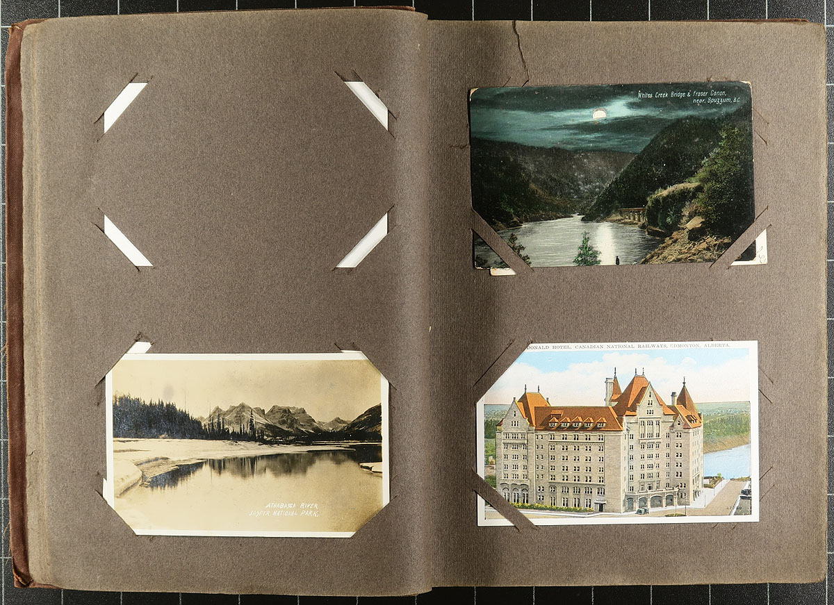 Nice collection of roughly 180 Canada and worldwide postcards in two postcard albums, 1900's-1930's. The lot essentially consists of two equal parts, the first album contains 90 worldwide cards (mostly colour, sepia and real photo cards), almost all with Great Britain views, with the second album containing Canada views (mostly Western and Central provinces), containing mostly color and real photo cards. We note a variety of subjects including buildings, cats, Christmas and Easter, scenic views and more. A nice lot with a few cards beyond the given date range, with most being in very fine condition. Estimate =