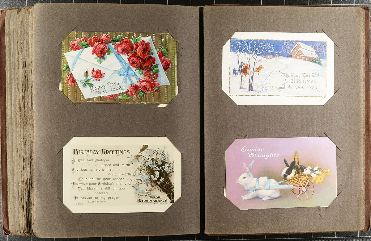 Nice collection of roughly 180 Canada and worldwide postcards in two postcard albums, 1900's-1930's. The lot essentially consists of two equal parts, the first album contains 90 worldwide cards (mostly colour, sepia and real photo cards), almost all with Great Britain views, with the second album containing Canada views (mostly Western and Central provinces), containing mostly color and real photo cards. We note a variety of subjects including buildings, cats, Christmas and Easter, scenic views and more. A nice lot with a few cards beyond the given date range, with most being in very fine condition. Estimate =