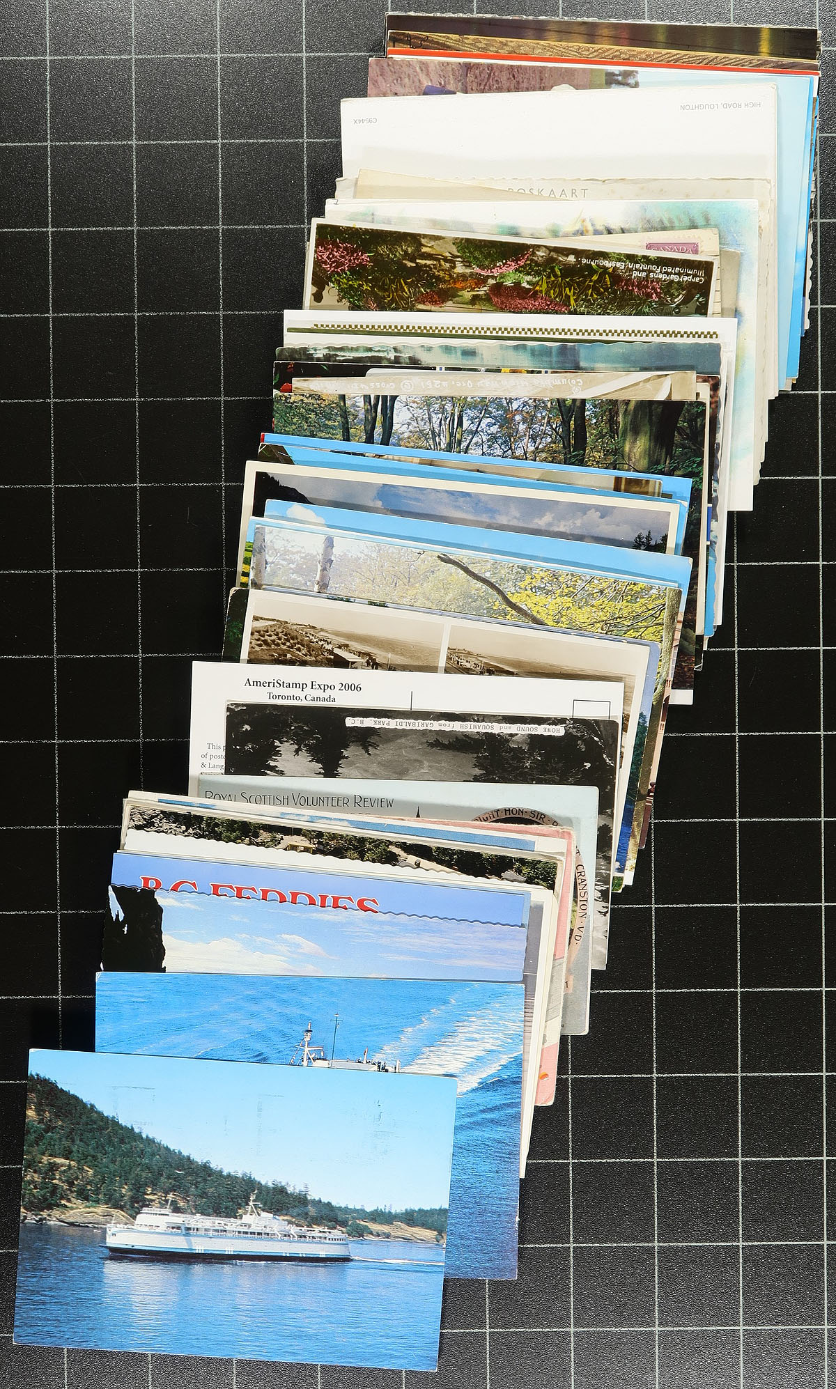 Accumulation of roughly 700 worldwide postcards loose in a box. A cursory check indicated classic cards, chromes, sepia, colour, and a few real photo cards. Representation generally ranges from Canada, United States, Great Britain (including Channel Islands), and European countries, but could contain others, noting a wide variety of collectable subjects including ships, transportation, animals, buildings, scenic views, royalty, and much more. We note some covers having bent covers, otherwise a fine to very fine lot for the postcard collector. Estimate =