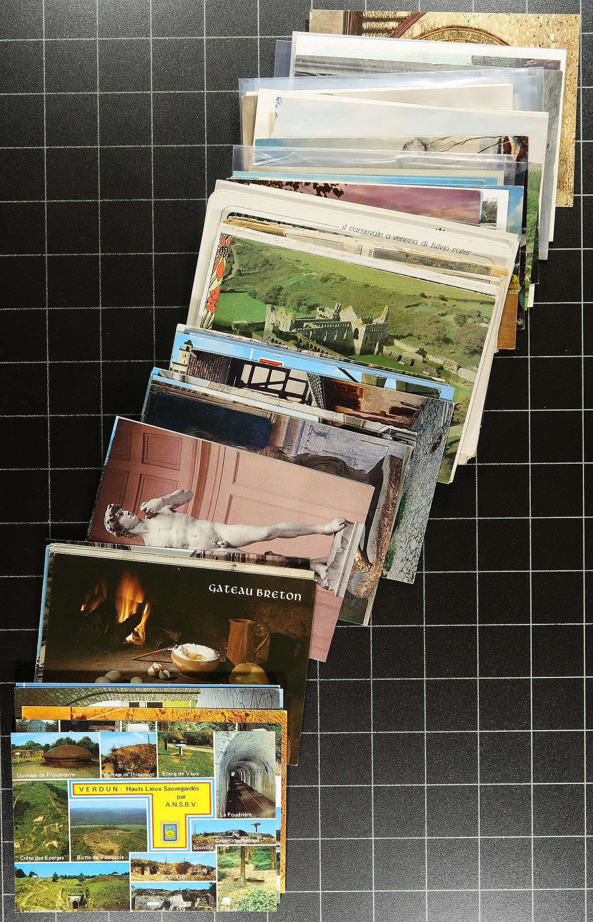 Accumulation of roughly 700 worldwide postcards loose in a box. A cursory check indicated classic cards, chromes, sepia, colour, and a few real photo cards. Representation generally ranges from Canada, United States, Great Britain (including Channel Islands), and European countries, but could contain others, noting a wide variety of collectable subjects including ships, transportation, animals, buildings, scenic views, royalty, and much more. We note some covers having bent covers, otherwise a fine to very fine lot for the postcard collector. Estimate =
