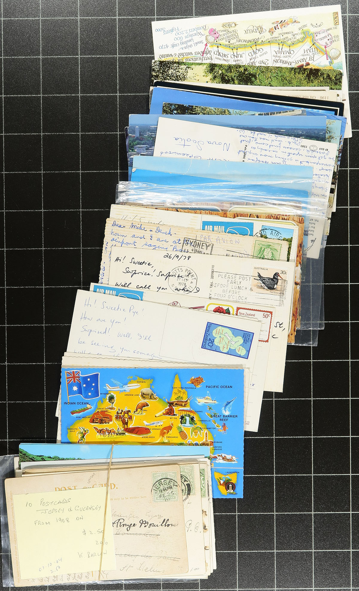 Accumulation of roughly 700 worldwide postcards loose in a box. A cursory check indicated classic cards, chromes, sepia, colour, and a few real photo cards. Representation generally ranges from Canada, United States, Great Britain (including Channel Islands), and European countries, but could contain others, noting a wide variety of collectable subjects including ships, transportation, animals, buildings, scenic views, royalty, and much more. We note some covers having bent covers, otherwise a fine to very fine lot for the postcard collector. Estimate =