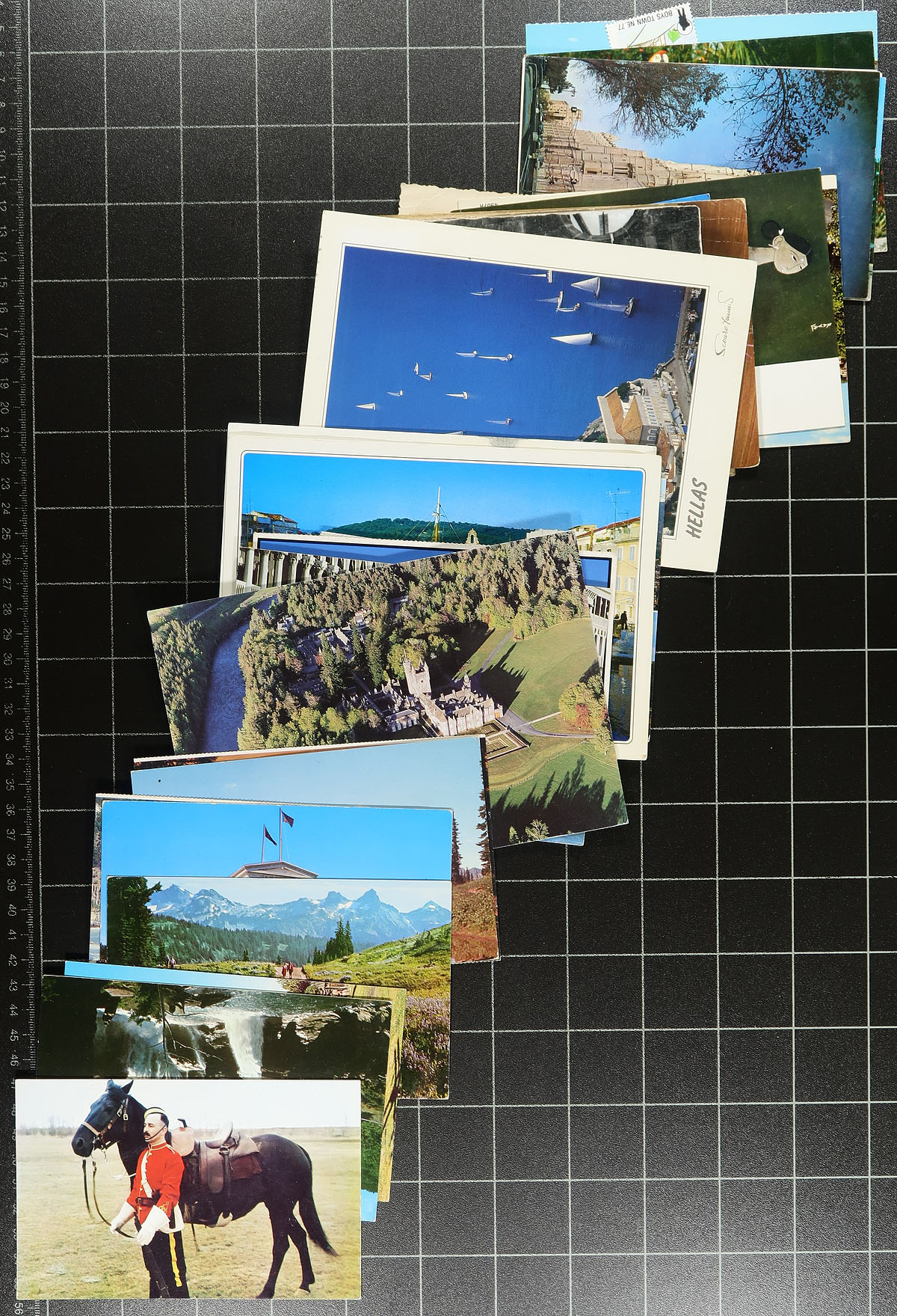 Accumulation of roughly 700 worldwide postcards loose in a box. A cursory check indicated classic cards, chromes, sepia, colour, and a few real photo cards. Representation generally ranges from Canada, United States, Great Britain (including Channel Islands), and European countries, but could contain others, noting a wide variety of collectable subjects including ships, transportation, animals, buildings, scenic views, royalty, and much more. We note some covers having bent covers, otherwise a fine to very fine lot for the postcard collector. Estimate =