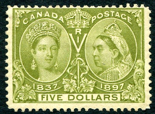 Fine mint hinged example of the $5.00 olive green high value 1897 Jubilee issue. Attractive full gum and fresh colour. A very attractive example of this elusive stamp. 2025 Scott US$1,300.00 =