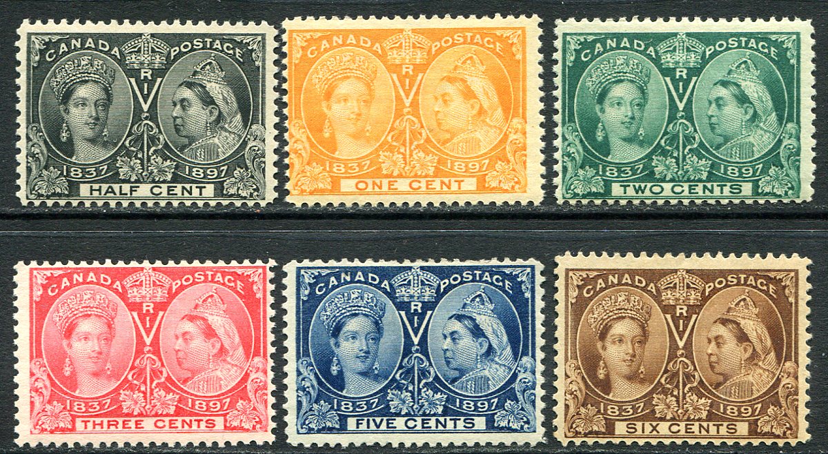 An attractive mint offering of six different 1897 QV Jubilee values, from the 1/2c black to 6c yellow brown (inclusive). The 1c, 2c and 3c values are Never Hinged, the remainder hinged. A great start to a mint Jubilee set. 2025 Scott US$642.50 =