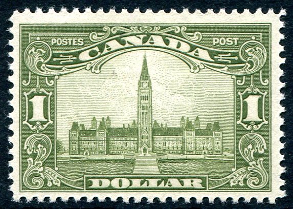 Fresh and VF centered mint Never Hinged example of the 1929 issue $1.00 olive green Parliament high value from the GeoV Scroll set. The $1.00 Parliament is considered by many to be the key GeoV era high value. 2025 Scott US$575.00 =