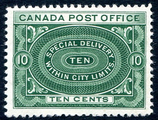 F/VF mint Lightly Hinged example of the Unitrade listed "no shading in value tablet" variety of the 1898 issue 10c green Special Delivery stamp. Here's your chance to get a great little mint stamp without having to pay a hefty premium for NH. Valued as a basic stamp by Scott. 2025 Scott US$170.00 =