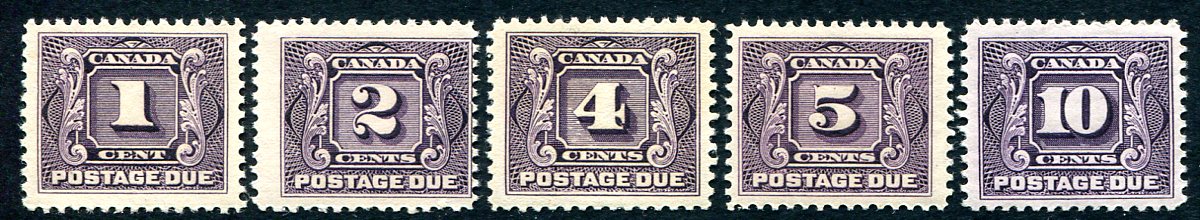 Fresh and F/VF mint Never Hinged / Lightly Hinged complete set of the first 1906-1928 period Postage Due issues. The first four values are Never Hinged, with the 10c value being Lightly Hinged. 2025 Scott US$390.00 =