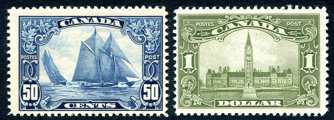 Fresh and Fine mint Never Hinged examples of the 50c Bluenose and $1.00 Parliament high values from the 1928-1929 George V "Scroll" series. A lovely duo. 2025 Scott US$1,000.00 =