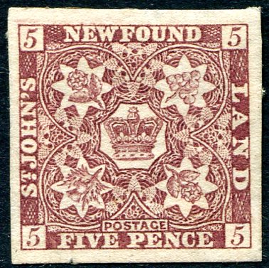 VF mint part OG hinge / album page remnant example of the 1857 issue 5p brown violet imperforate on wove paper with mesh. Unitrade is $450.00 for VF mint Hinged. 2025 Scott US$325.00 =