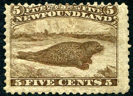VG/Fine mint hinged, full original gum hinged example of the 1865 issue 5c brown Harp Seal. A great little stamp, seldom seen mint. 2025 Scott US$750.00 =