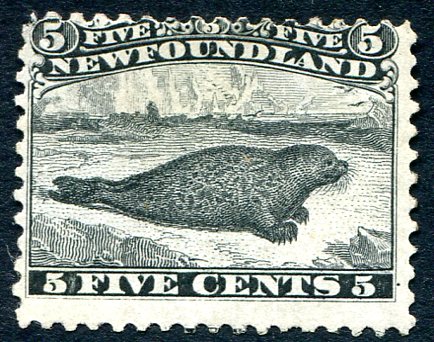 VG/Fine mint Hinged, partially regummed example of the iconic 1868 issue 5c black "Harp Seal" from the first decimal currency series. 2025 Scott US$750.00 =