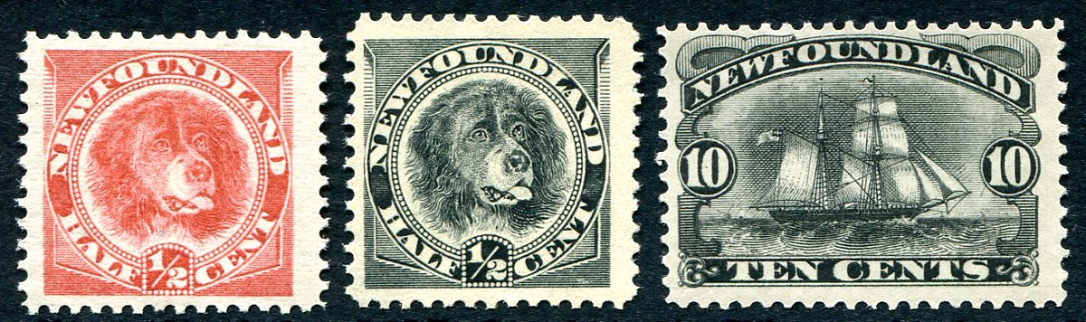 F/VF mint trio of 1887-1896 issues including the 1/2c red rose & 1/2c black "Newfoundland Dog", plus the 10c black "Schooner". The 1/2c red rose is Never Hinged, the other two Lightly Hinged. A very fresh trio. 2025 Scott US$179.00 =