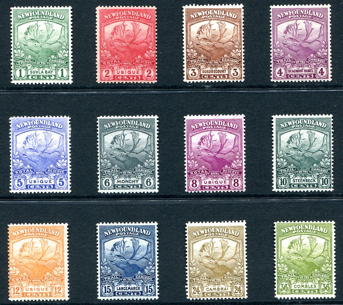 Complete mint Lightly Hinged set of twelve of the "Trail of the Caribou" WWI memorial issue of 1919. A great WWI thematic series, one of the most iconic sets from Newfoundland. 2025 Scott US$293.25 =
