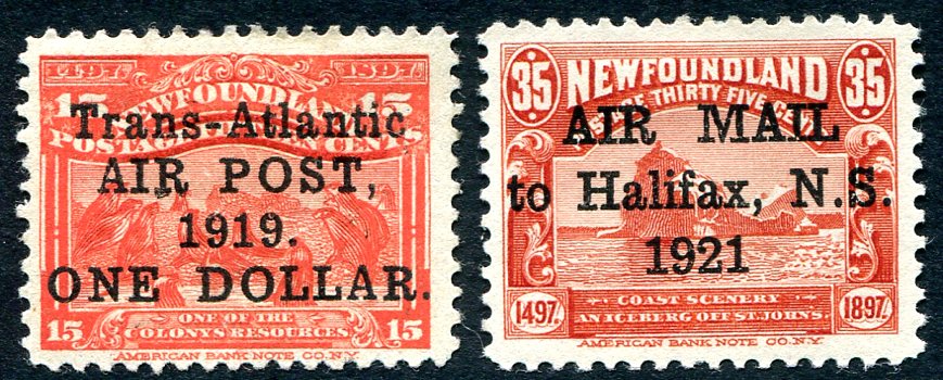 Duo of mint hinged early overprinted airmails, consisting of the 1919 Trans-Atlantic $1.00 and the 1921 St. John's to Halifax flight. A lovely pair of stamps. 2025 Scott US$350.00 =