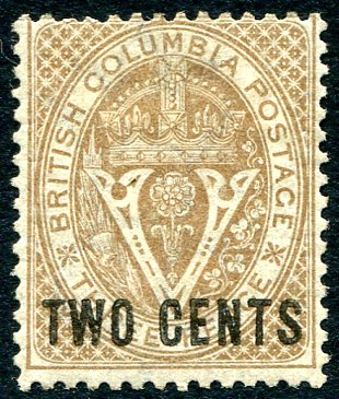 Fresh and Fine mint no gum example of the 1867 issue Two Cents surcharge on 3p brown perf 14 Seal of BC. 2025 Scott US$150.00 =