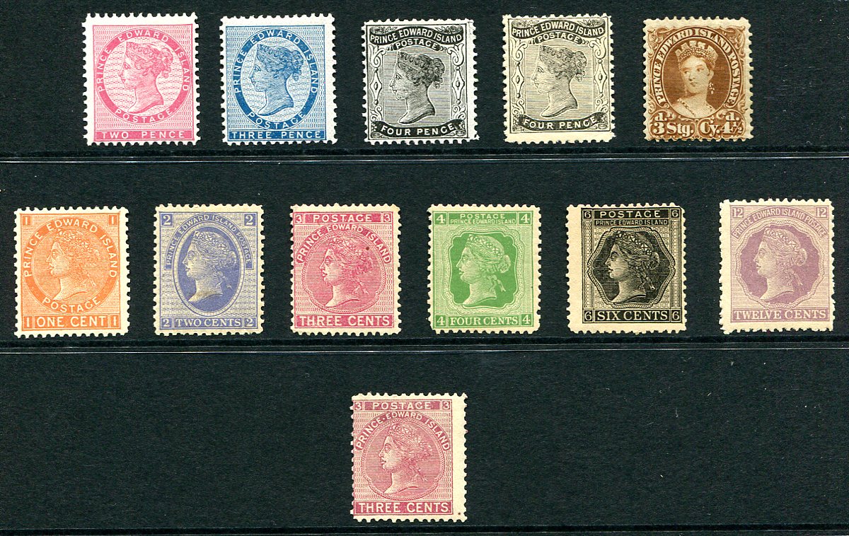 A lovely mint Lightly Hinged group of Provincial Prince Edward Island, with a dozen different stamps / sub-types, nicely wrapped up with the "dot between PRINCE EDWARD" Unitrade listed sub-type of the 1872 issued 3c rose (as Scott does not list this, valued as a regular stamp). 2025 Scott US$272.00 =
