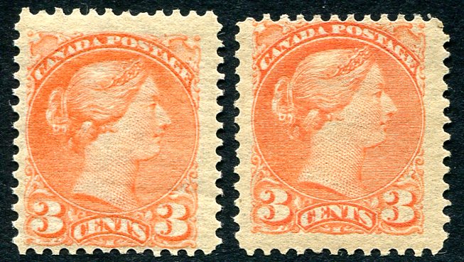Fresh and Fine mint Never Hinged duo of singles of the 3c vermilion Small Queen. Bright original colour, sharp and detailed impression. A few handling bends noted for the record. 2025 Scott Classic for Never Hinged US$500.00 =