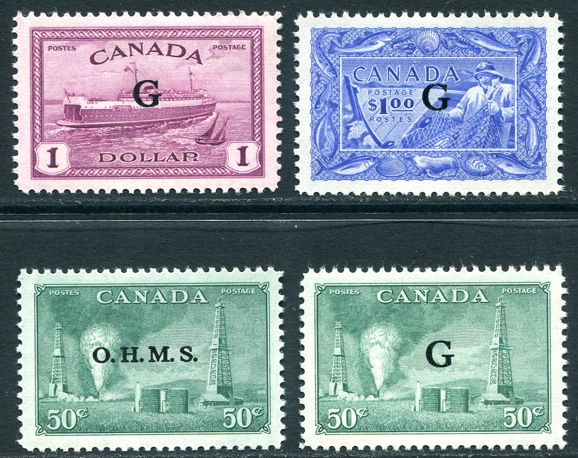 Fresh and F/VF mint Lightly Hinged complete run of first the 1949-1950 "O.H.M.S." overprinted official set of nine plus the Official Airmail and Official Special Delivery stamps. Includes the very scarce 50c Lumbering (#O9, only 50,000 overprinted). 2025 Scott US$426.50 =