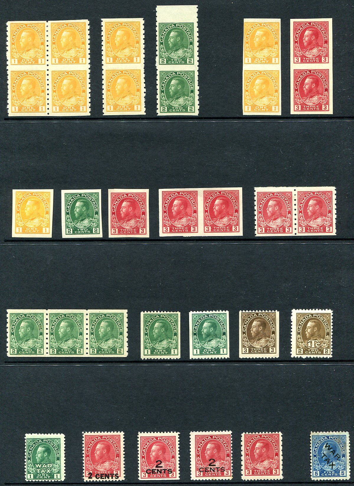 An interesting array of George V Admirals, all being Coils, part-perforates, imperforates and War Tax, all neatly arranged on a single stockpage. Includes a block, a strip of three, six pairs and 14 singles. A mix of hinging, generally Lightly Hinged, but with a couple NH and a couple Hinge remnant. The 5c diagonal "WAR TAX" at lower-right is used, and included (indistinct postmark/revenue cancel). The catalogue value adds up quickly here. Estimate =