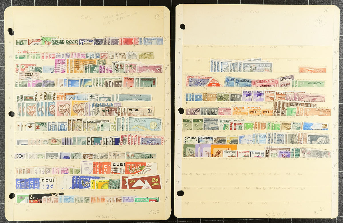 Latin America. Nice group of mint and used Latin America stamps, 1890's-1980's, containing roughly 1,500 stamps in 19 stock pages. We note better representation from Cuba, Mexico, Nicaragua, El Salvador and a few others, with a spot check indicating singles, sets, and partial sets, cataloguing $10 and up, including Mexico 896a souvenir sheet (nh, c.v. $75), leaving better finds to the dedicated collector. Owner's 2011 catalogue value for the lot totals US$664.00, making this a nice lot for all worldwide collectors. Estimate =