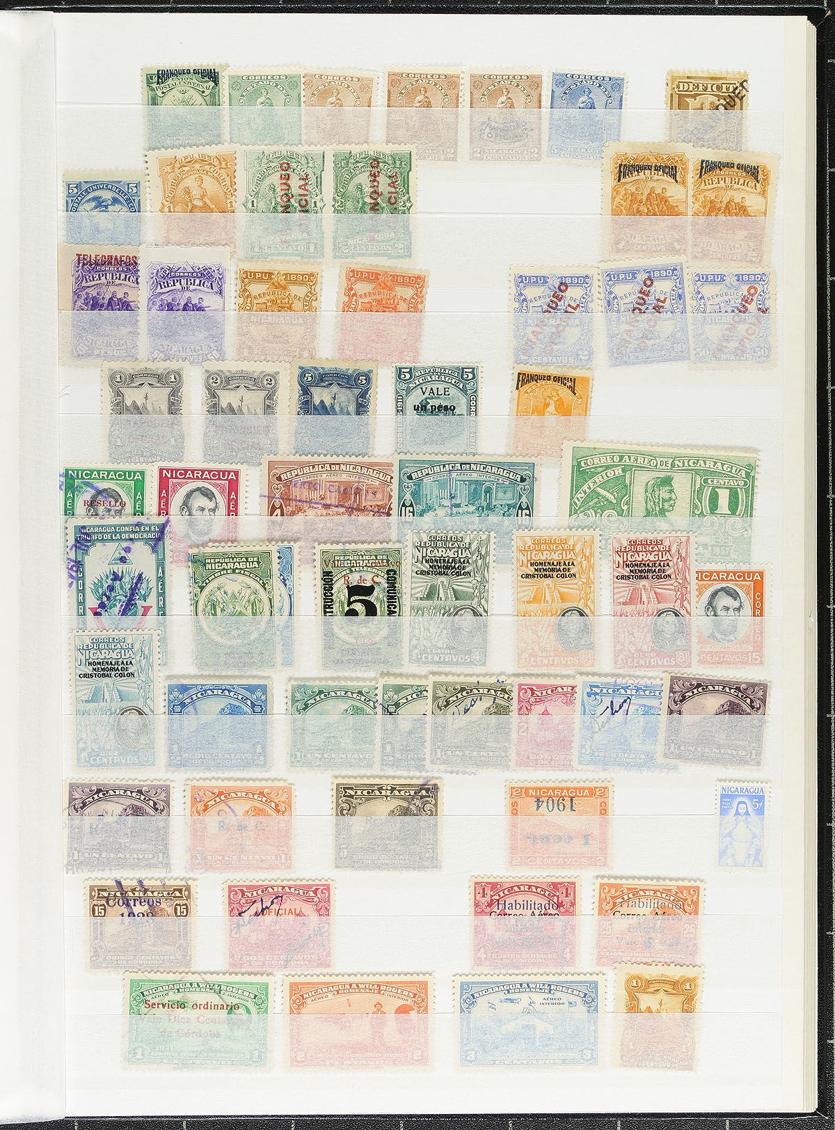 Latin America. Collection / accumulation of mint and used Latin America, 1880's-1990's, containing a few thousand stamps in several stock and album pages, housed in a stockbook, binder, and loose pages. The lot contains better representation from Nicaragua (roughly 1,500 stamps in a stockbook and stock pages in a binder), Cuba (roughly 700 stamps from the 1960's to the 1990's), along with El Salvador, Mexico, Guatemala, Costa Rica, and more, on several album pages. A cursory check indicated regular and back of the book issues, with catalogue values generally $3.00 and under, leaving better finds for the dedicated collector. A nice lot for the worldwide collector, overall fine to very fine. Estimate =