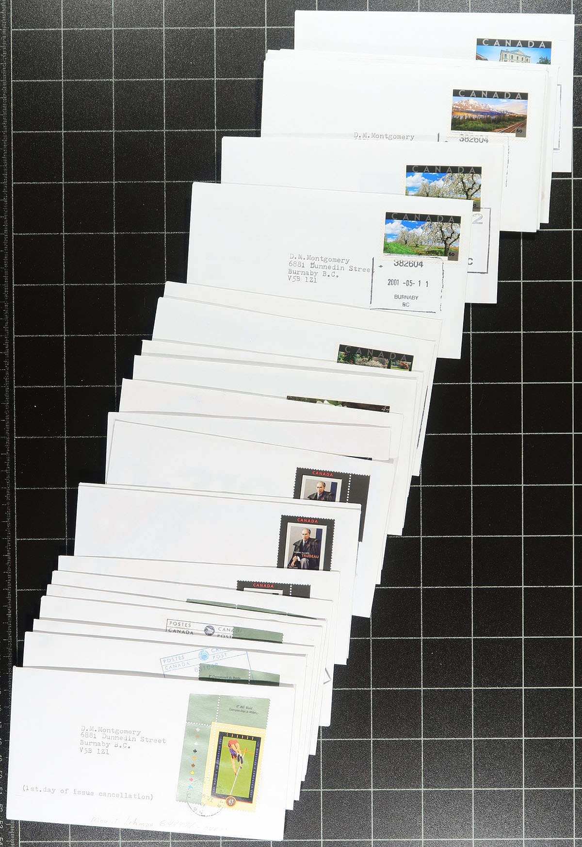 British Columbia Postmarks / FDC #1. Group of approx. 600 covers from issues ranging in years 2000 to 2003 noting singles, plate blocks, and souvenir sheet frankings. The lot contains no official first day covers, as the collector meticulously collected first day covers with Vancouver and lower mainland postmarks, with most pages indicating the variety of postal outlets. Some issues have up to 10 first day covers (from a variety of different cities or outlets within each city). Ideal for the first day cover or British Columbia postmark collector, as this would be a near impossible collection to duplicate. Estimate =