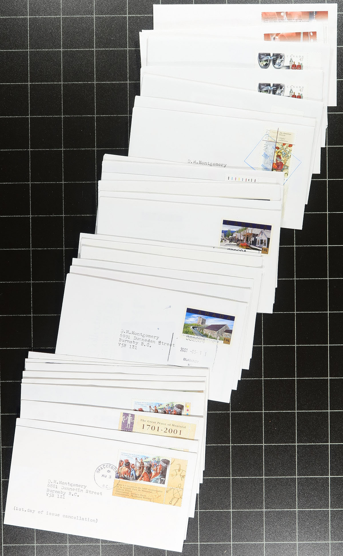 British Columbia Postmarks / FDC #1. Group of approx. 600 covers from issues ranging in years 2000 to 2003 noting singles, plate blocks, and souvenir sheet frankings. The lot contains no official first day covers, as the collector meticulously collected first day covers with Vancouver and lower mainland postmarks, with most pages indicating the variety of postal outlets. Some issues have up to 10 first day covers (from a variety of different cities or outlets within each city). Ideal for the first day cover or British Columbia postmark collector, as this would be a near impossible collection to duplicate. Estimate =