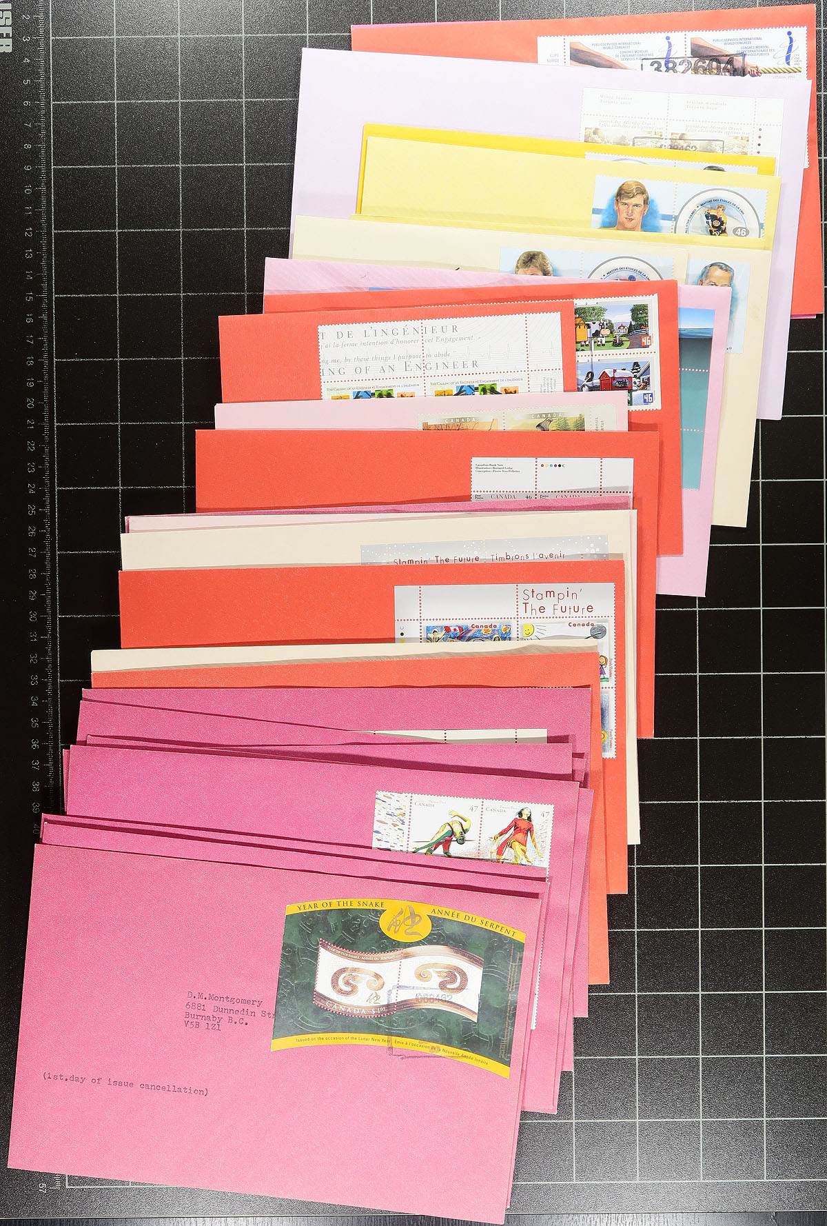 British Columbia Postmarks / FDC #1. Group of approx. 600 covers from issues ranging in years 2000 to 2003 noting singles, plate blocks, and souvenir sheet frankings. The lot contains no official first day covers, as the collector meticulously collected first day covers with Vancouver and lower mainland postmarks, with most pages indicating the variety of postal outlets. Some issues have up to 10 first day covers (from a variety of different cities or outlets within each city). Ideal for the first day cover or British Columbia postmark collector, as this would be a near impossible collection to duplicate. Estimate =