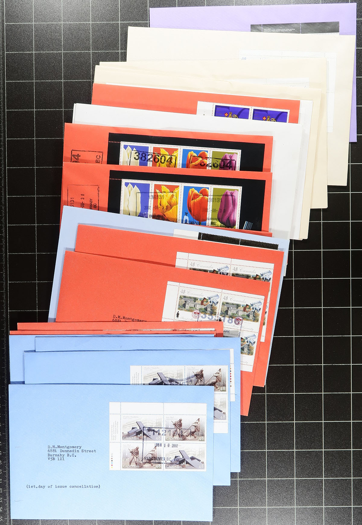 British Columbia Postmarks / FDC #1. Group of approx. 600 covers from issues ranging in years 2000 to 2003 noting singles, plate blocks, and souvenir sheet frankings. The lot contains no official first day covers, as the collector meticulously collected first day covers with Vancouver and lower mainland postmarks, with most pages indicating the variety of postal outlets. Some issues have up to 10 first day covers (from a variety of different cities or outlets within each city). Ideal for the first day cover or British Columbia postmark collector, as this would be a near impossible collection to duplicate. Estimate =