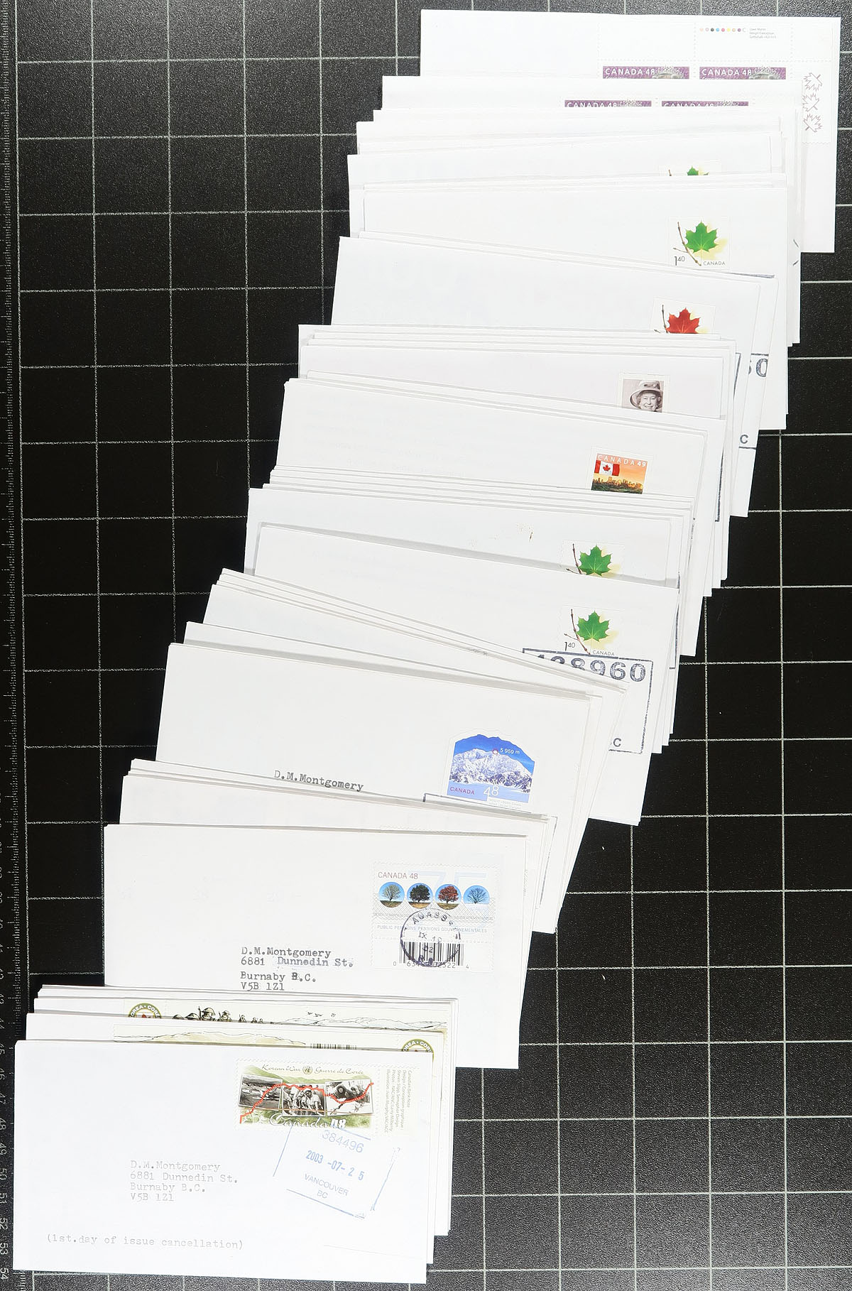 British Columbia Postmarks / FDC #1. Group of approx. 600 covers from issues ranging in years 2000 to 2003 noting singles, plate blocks, and souvenir sheet frankings. The lot contains no official first day covers, as the collector meticulously collected first day covers with Vancouver and lower mainland postmarks, with most pages indicating the variety of postal outlets. Some issues have up to 10 first day covers (from a variety of different cities or outlets within each city). Ideal for the first day cover or British Columbia postmark collector, as this would be a near impossible collection to duplicate. Estimate =