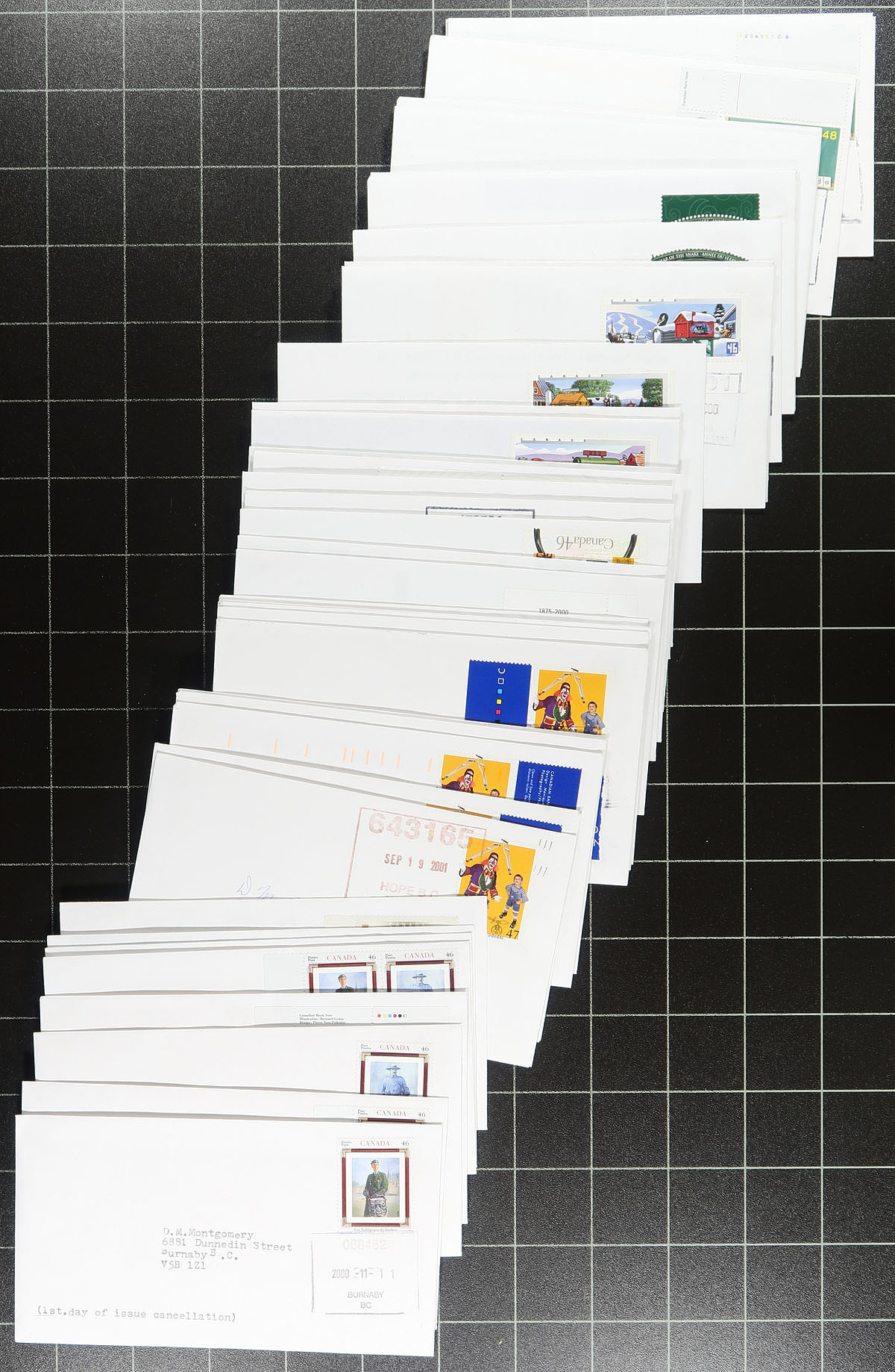 British Columbia Postmarks / FDC #1. Group of approx. 600 covers from issues ranging in years 2000 to 2003 noting singles, plate blocks, and souvenir sheet frankings. The lot contains no official first day covers, as the collector meticulously collected first day covers with Vancouver and lower mainland postmarks, with most pages indicating the variety of postal outlets. Some issues have up to 10 first day covers (from a variety of different cities or outlets within each city). Ideal for the first day cover or British Columbia postmark collector, as this would be a near impossible collection to duplicate. Estimate =