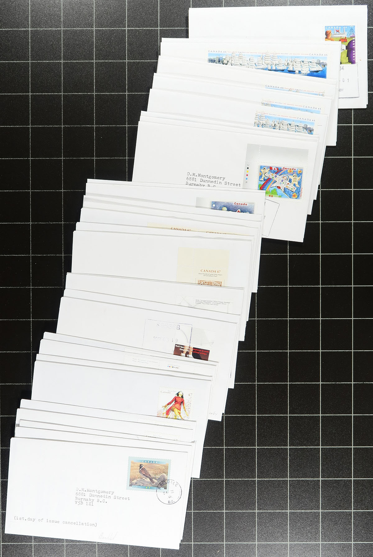 British Columbia Postmarks / FDC #1. Group of approx. 600 covers from issues ranging in years 2000 to 2003 noting singles, plate blocks, and souvenir sheet frankings. The lot contains no official first day covers, as the collector meticulously collected first day covers with Vancouver and lower mainland postmarks, with most pages indicating the variety of postal outlets. Some issues have up to 10 first day covers (from a variety of different cities or outlets within each city). Ideal for the first day cover or British Columbia postmark collector, as this would be a near impossible collection to duplicate. Estimate =