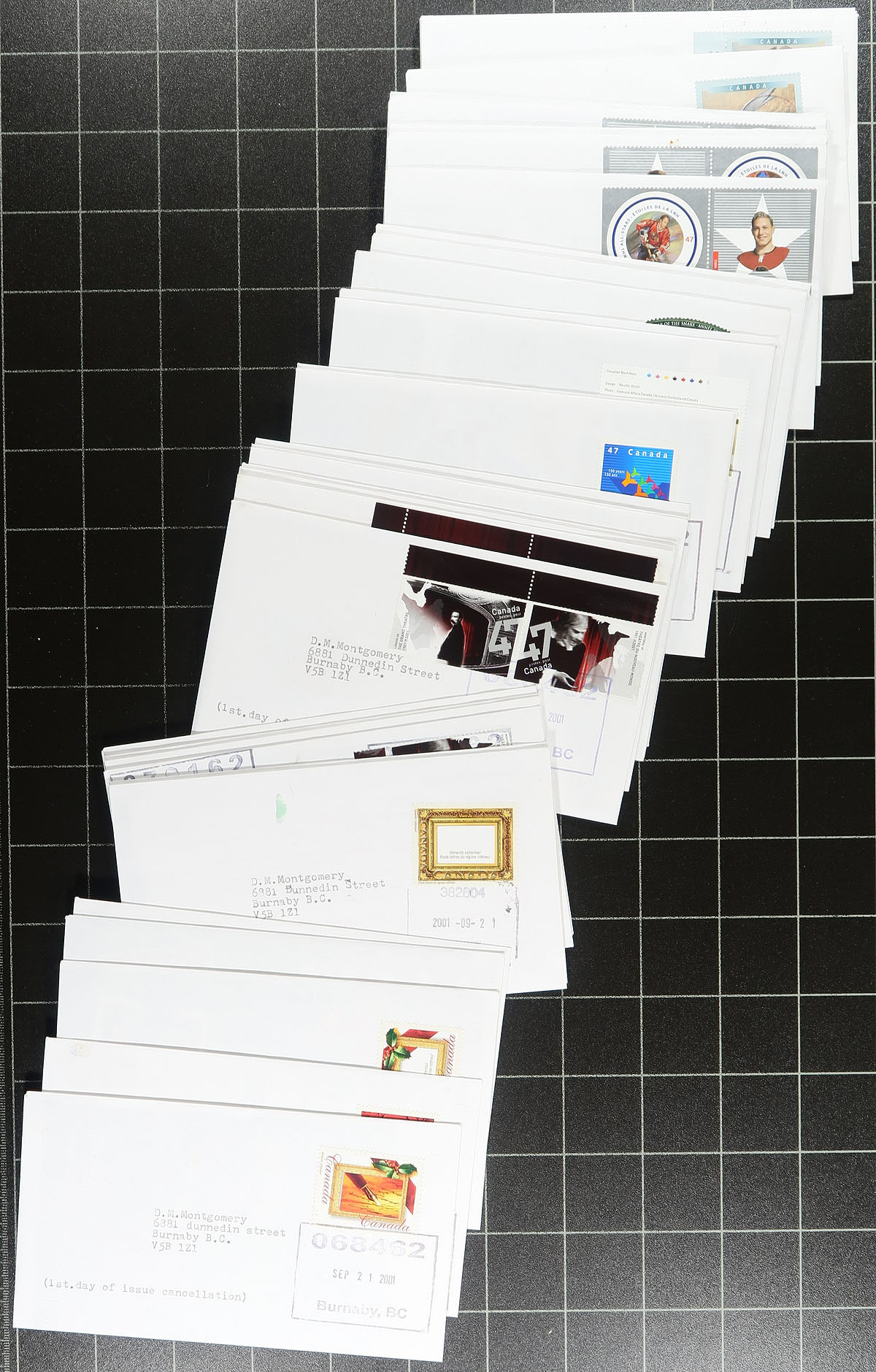 British Columbia Postmarks / FDC #1. Group of approx. 600 covers from issues ranging in years 2000 to 2003 noting singles, plate blocks, and souvenir sheet frankings. The lot contains no official first day covers, as the collector meticulously collected first day covers with Vancouver and lower mainland postmarks, with most pages indicating the variety of postal outlets. Some issues have up to 10 first day covers (from a variety of different cities or outlets within each city). Ideal for the first day cover or British Columbia postmark collector, as this would be a near impossible collection to duplicate. Estimate =