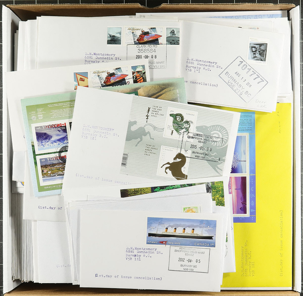 British Columbia Postmarks / FDC #2. Group of roughly 400 Canada first day covers from the years 2009 to 2015 noting singles, plate blocks, and souvenir sheet frankings. The lot contains no official first day covers, as the collector meticulously collected first day covers with Vancouver and lower mainland postmarks, with most pages indicating the variety of postal outlets. Some issues have up to 10 first day covers (from a variety of different cities or outlets within each city). Ideal for the first day cover or British Columbia postmark collector, as this would be a near impossible collection to duplicate. Estimate =