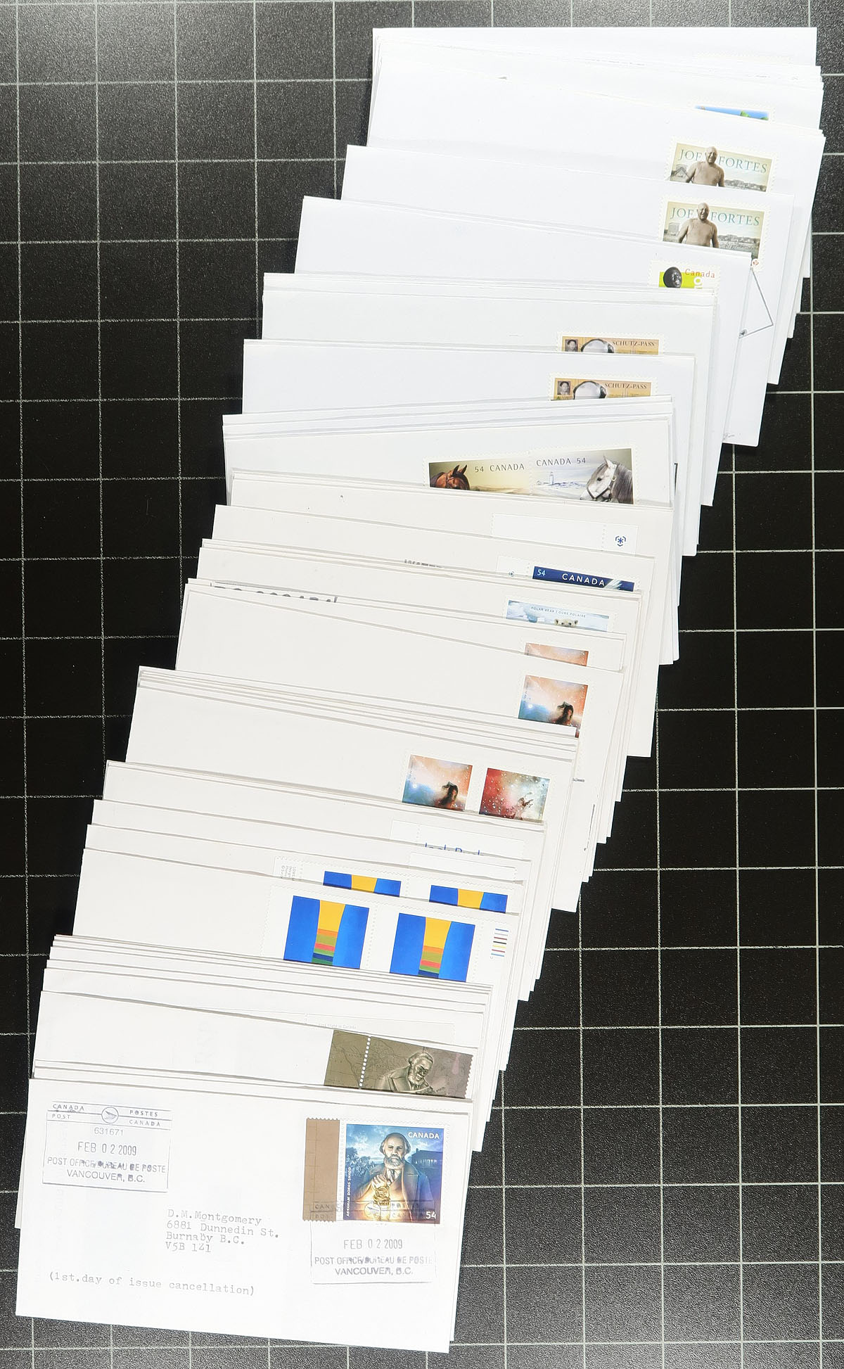 British Columbia Postmarks / FDC #2. Group of roughly 400 Canada first day covers from the years 2009 to 2015 noting singles, plate blocks, and souvenir sheet frankings. The lot contains no official first day covers, as the collector meticulously collected first day covers with Vancouver and lower mainland postmarks, with most pages indicating the variety of postal outlets. Some issues have up to 10 first day covers (from a variety of different cities or outlets within each city). Ideal for the first day cover or British Columbia postmark collector, as this would be a near impossible collection to duplicate. Estimate =