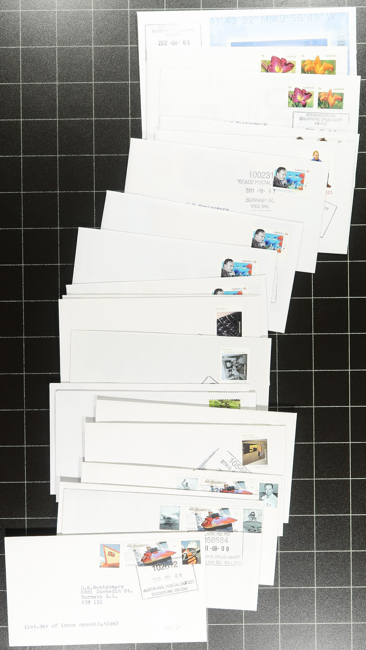 British Columbia Postmarks / FDC #2. Group of roughly 400 Canada first day covers from the years 2009 to 2015 noting singles, plate blocks, and souvenir sheet frankings. The lot contains no official first day covers, as the collector meticulously collected first day covers with Vancouver and lower mainland postmarks, with most pages indicating the variety of postal outlets. Some issues have up to 10 first day covers (from a variety of different cities or outlets within each city). Ideal for the first day cover or British Columbia postmark collector, as this would be a near impossible collection to duplicate. Estimate =