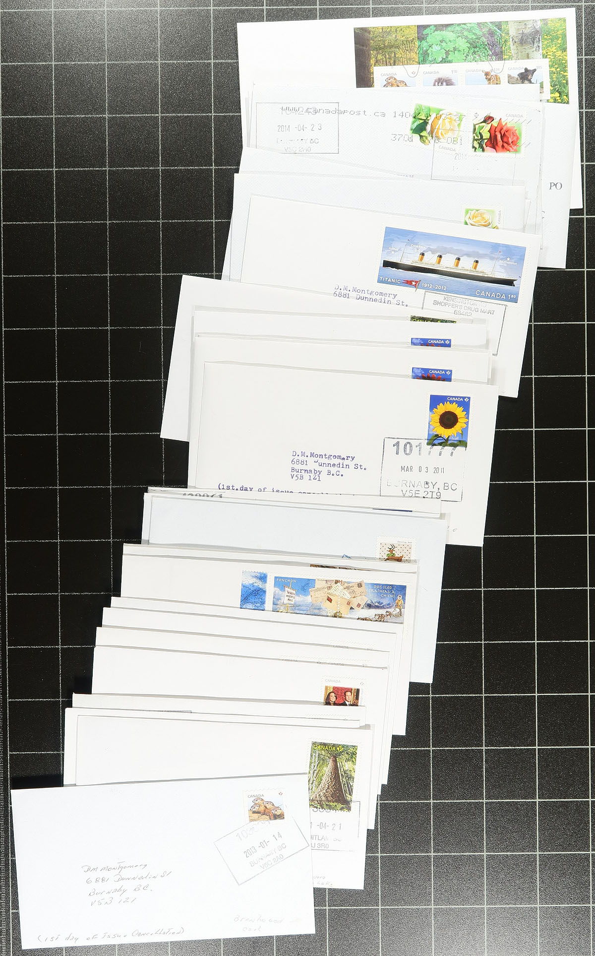 British Columbia Postmarks / FDC #2. Group of roughly 400 Canada first day covers from the years 2009 to 2015 noting singles, plate blocks, and souvenir sheet frankings. The lot contains no official first day covers, as the collector meticulously collected first day covers with Vancouver and lower mainland postmarks, with most pages indicating the variety of postal outlets. Some issues have up to 10 first day covers (from a variety of different cities or outlets within each city). Ideal for the first day cover or British Columbia postmark collector, as this would be a near impossible collection to duplicate. Estimate =